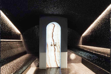 Помещение изнутри отделывается камнем, вдоль стен располагаются скамьи, облицованные мозаикой, влажный подогретый пар вперемешку с благовониями полностью заполняет помещение.